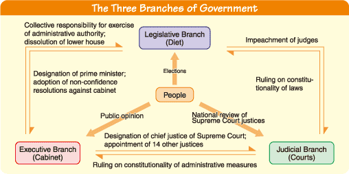 Japan has a parliamentary system of government like Britain and Canada. Unlike the Americans or the French, the Japanese do not elect a president directly. Diet members elect a prime minister from among themselves. The prime minister forms and leads the cabinet of ministers of state. The cabinet, in the exercise of executive power, is responsible to the Diet.
