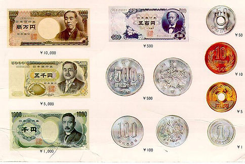 The yen is the unit of currency in Japan. There are four kinds of bills (10,000 yen, 5,000 yen, 2,000 yen, 1,000 yen) and six kinds of coins (500 yen, 100 yen, 50 yen, 10 yen, 5 yen, 1 yen) used. All of the bills and coins are different sizes. For example, the bills descend in size from 10,000 Yen to 1,000 Yen.